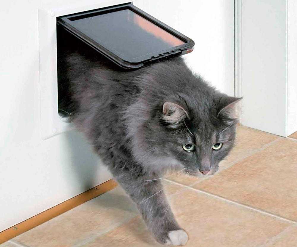 Дверца для кошек в дверь является уменьшенной копией стандартной конструкции. Ее заслонка может крепиться в горизонтальном или вертикальном положении с помощью пружин. Такие модели не пропускают запахи и холод, потому что закрываются герметично, могут управляться в ручном и дистанционном режимах.