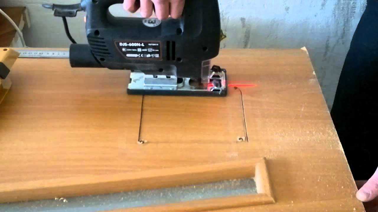 До начала работы лобзиком убедитесь, что дверь закрыта. Займите устойчивое рабочее положение и вставьте пилку для лобзика в одно из отверстий. Держите лобзик прижатым к двери и убедитесь, что он не движется вверх и вниз во время выпиливания. Не спешите при работе лобзиком. Аккуратно перемещайтесь вдоль разметки и выпиливайте как можно более прямые линии между просверленными отверстиями.