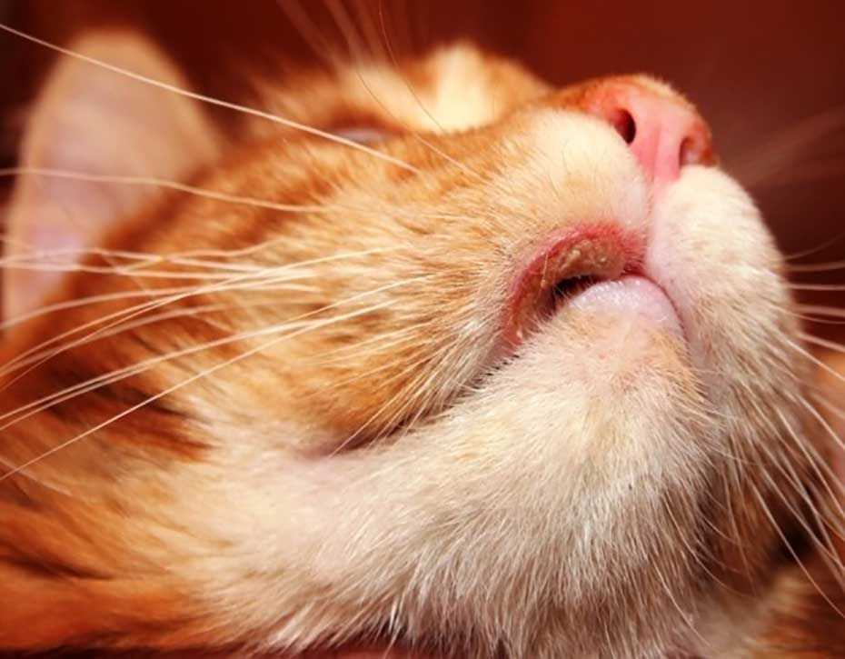 Это безболезненные язвочки округлой формы с приподнятыми краями, которые вначале образуются на верхней губе и лицевой зоне кошки, а затем быстро распространяются на шею и спину. Зона локализации язвочек обычно воспаляется и припухает, но неприятных ощущений животное может не испытывать.
