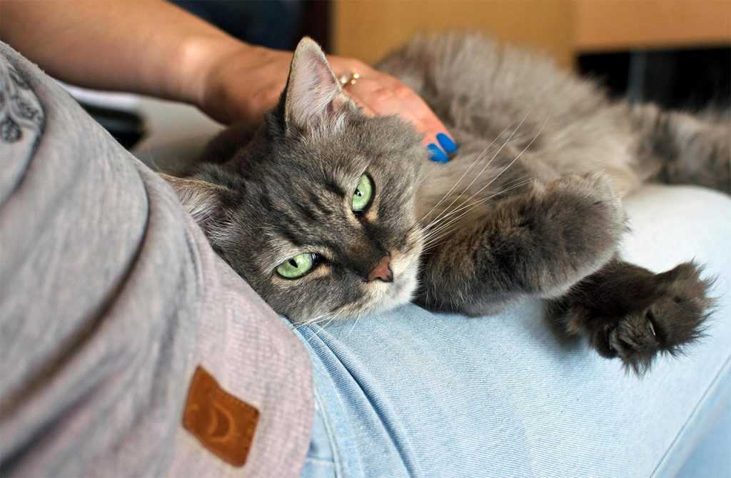 Во время сеанса кошачьей терапии у человека улучшается настроение от общения с домашним любимцем и исчезает беспокоящая его боль.