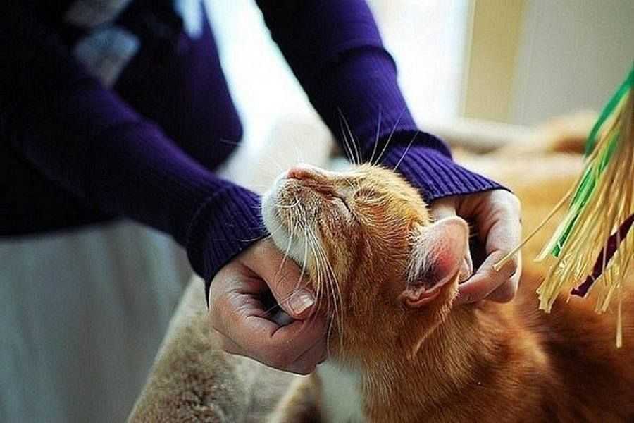 Когда кошка наконец доверчиво подошла к вам, чтобы приласкаться, не нужно в этот момент брать её на руки, тем более резким движением. Просто присядьте рядом, почешите ей голову между ушами или под подбородком, позвольте потереться об вас мордочкой и погладьте в этот момент её переносицу.