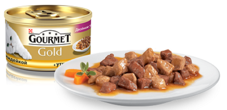- Gourmet Gold — паштеты и биточки с подливой. Вкус курицы, утки, кролика, печени и рыбы. Расфасовывается в жестяные порционные баночки.