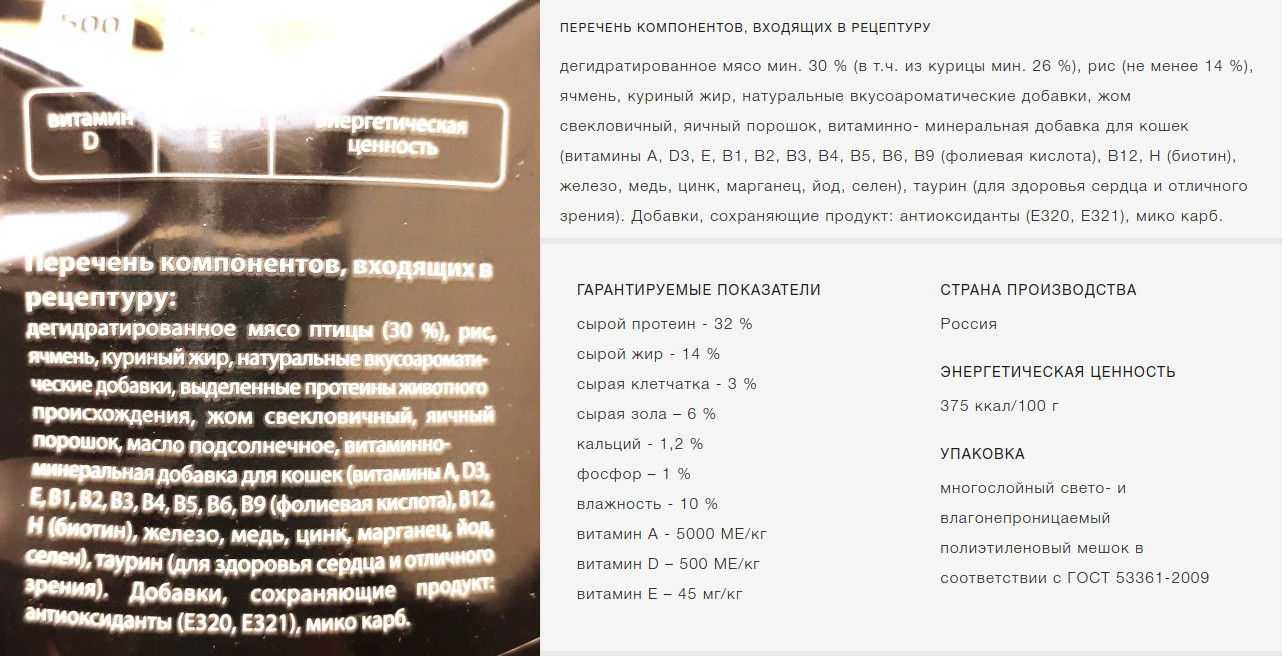- Полезные добавки (пребиотики для улучшения микрофлоры пищеварительного тракта; соли кальция и DL-метионин — для контроля за уровнем pH мочи; таурин — для зубов, когтей и костей, сухие пивные дрожжи — источник протеина и витаминов группы В; Омега-3 и Омега-6 — жирные кислоты против воспалительных процессов и старения организма; электролиты — благоприятно влияют на работу сердечной мышцы, восстанавливают клеточный энергообмен; L-карнитин, L-цистин, L-триптофан, L-лизин — момогают нарищивать мышечную массу; микрокристаллическая целлюлоза — придает гранулам форму).