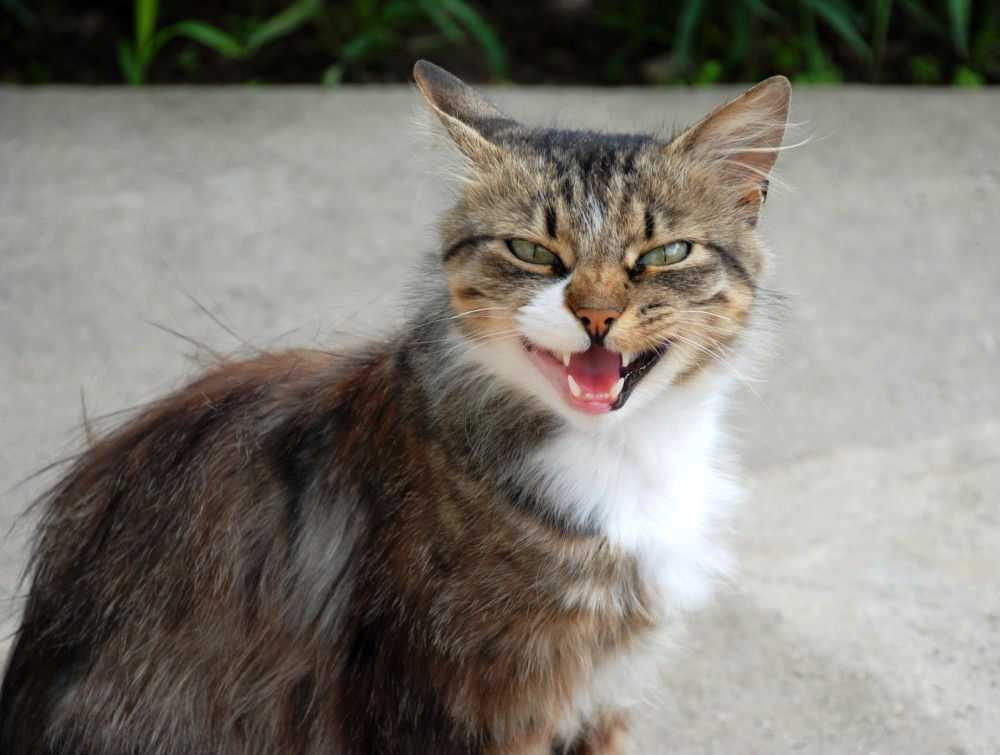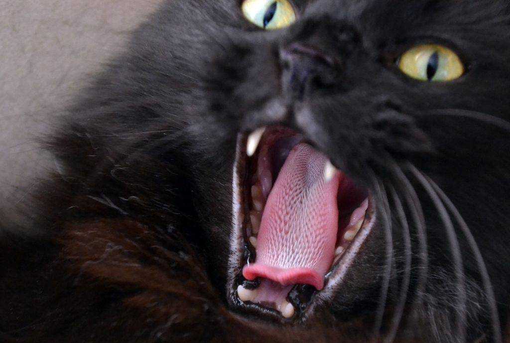Но иногда кошка беспорядочно открывает рот, а иногда оставляет его открытым на некоторое время, прежде чем закрыть.
