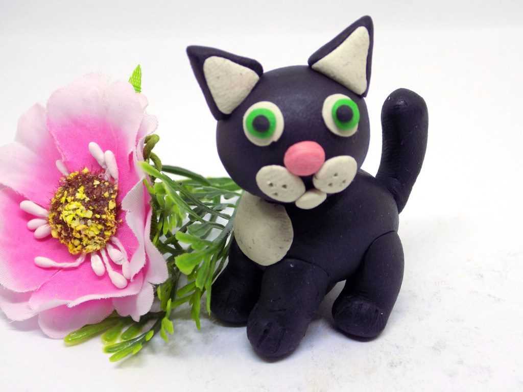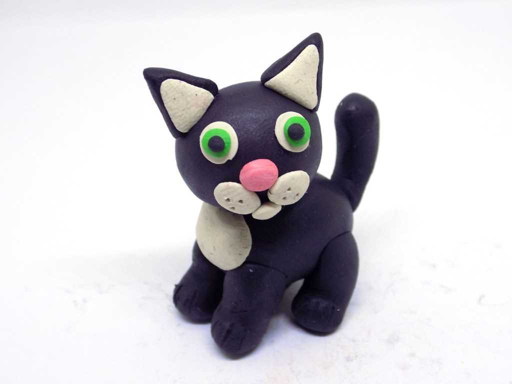Наконец, формируем небольшие зрачки из кусочков черного пластилина. Наш котик из пластилина пошагово готов.