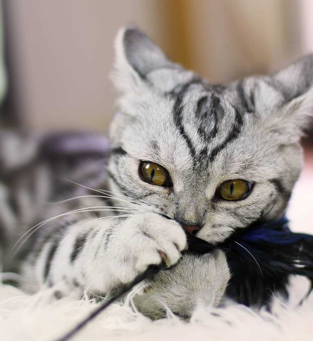 Котенок окраса серебристый табби играет с удочкой-дразнилкой