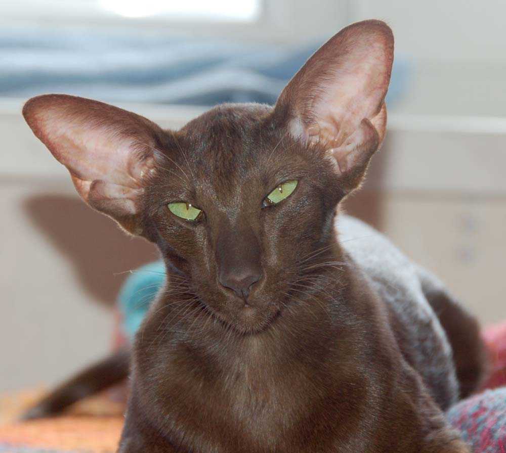 - Ориентальная кошка – эта порода кошек обладает самыми большими ушами. Они грациозны, обладают эмоциональным выражением мордочки. Характер ориенталов дружелюбный и преданный.