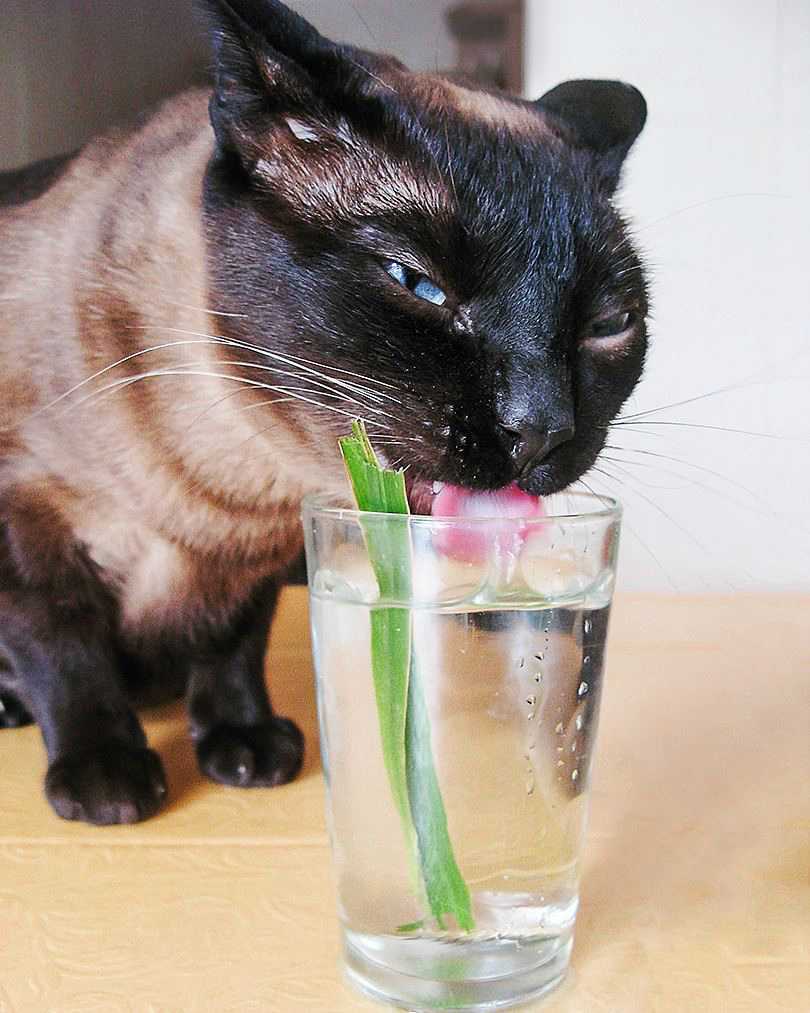 Некоторым кошкам нравится пить исключительно из высокой посуды. Таким кошкам лучше выделить стакан, кружку или вазу. Можно приобрести собачью миску на подставке (высота регулируется).