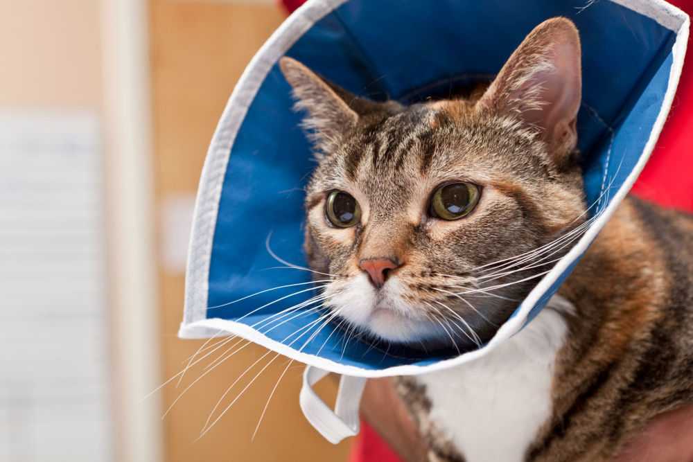 Питомец может начать вылизывать рану, чтобы не допустить этого, нужно надеть на кота специальный воротник. Снимать его разрешается только на время кормления. Также животное может тереться раной о пол – для предотвращения ее инфицирования нужно использовать подгузник, прорезав сзади отверстие для хвоста. Подойдут самые маленькие детские подгузники или специальные изделия для животных. Кот не должен постоянно находиться в подгузнике, его можно использовать, пока животное особенно активно пытается вылизываться.