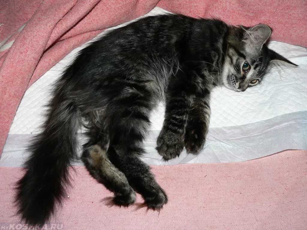 - Задние лапки кота бесконтрольно разъезжаются в стороны.