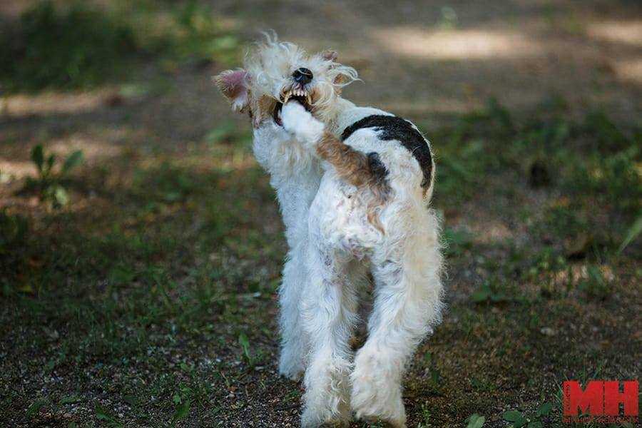 Агрессии к сородичам у моего жесткошерстного фокстерьера нет вообще. Я могу ее выпустить к любым собакам, даже к склонным к агрессии. Она ведет себя в общении с ними идеально: показывает все знаки примирения, а если на нее нападают, она… просто замирает! Она не поджимает хвост, не визжит, не отвечает агрессией, а вместо этого отворачивает голову и стоит, молча. Ее кусают, а она не шевелится. Поэтому агрессивным собакам с ней не интересно. Когда агрессор отходит, Хомса тут же разворачивается и бежит к нему: класс, было весело, давай еще поиграем! После третьей неудачной попытки ее съесть, все начинают играться.