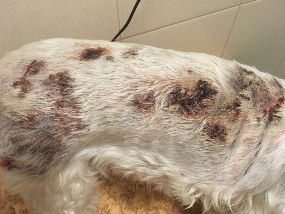 Фото. Так проявляется генерализованный демодекоз у собак: множественные поражения с потерей шерсти, корками, гнойничками с кровянистым отделяемым