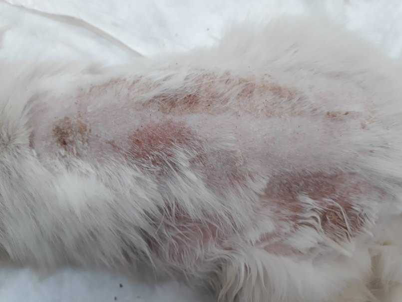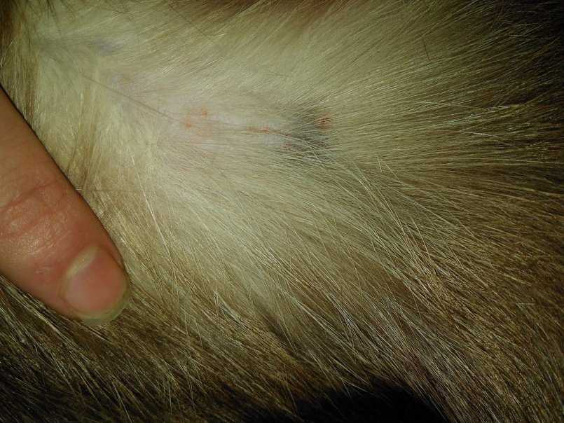 При раздвигании шерсти можно увидеть на коже живых блох и темные мелкие крупинки их экскрементов. Блохи любят прятаться в подмышечных впадинах, на внутренней поверхности ляжек, на шее и под мордой.
