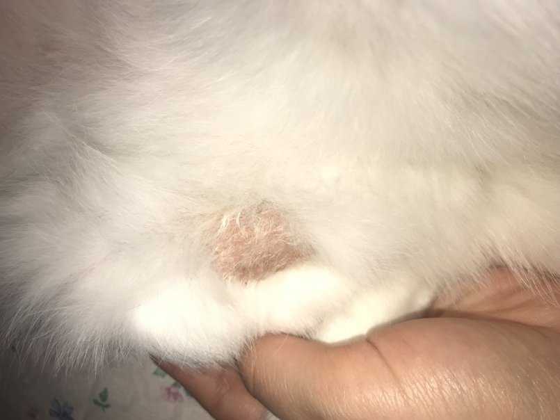 - Выпадение шерсти и появление мелких узелков, чаще всего на спине, пояснице, крестце, животе и бедрах.