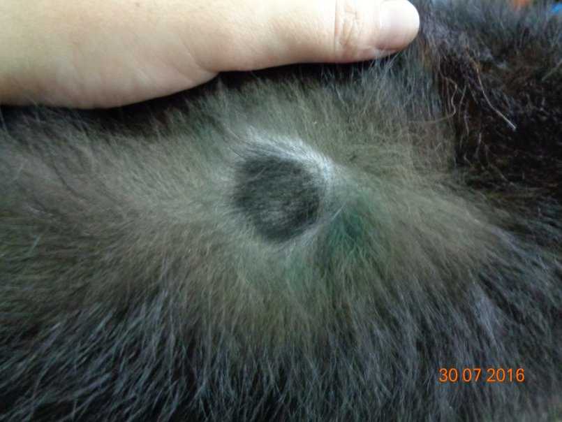 влажным. При мокнущем дерматите кожа будто содрана, сочится сукровицей или гноем, шерсть вокруг ранки выпадает.
