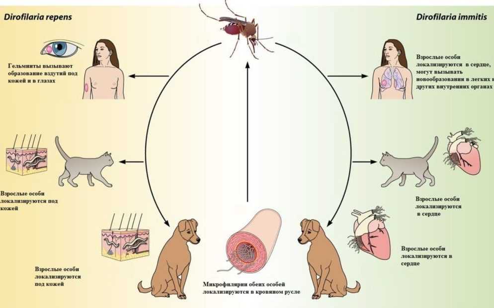 В подавляющем большинстве случаев собака заражается глистами посредством проглатывания их яиц. Но существует и другой путь заражения – трансмиссивный, посредством укусов кровососущих насекомых. Кроме того, проникновение паразита возможно через повреждения на коже животного. Новорожденные щенки легко заражаются от матери – носительницы глистной инвазии.