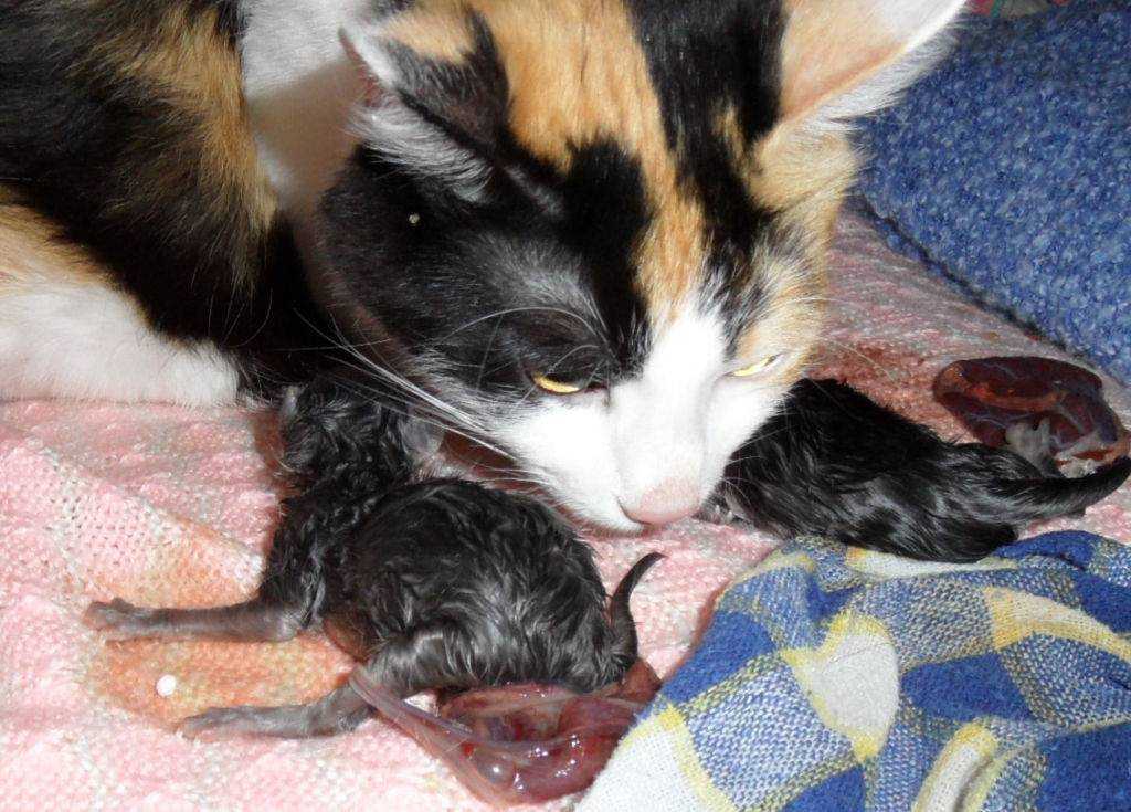 Как только малыш рождается, кошка вылизывает его мордочку, перегрызает пуповину и съедает послед. Если роженица не обращает внимания на котенка, а изгнание происходит слишком быстро, возможно питомица пребывает в стремительных родах. Такое осложнение сопряжено с сильной болью, поэтому желательно сразу забирать котят из гнезда, удалять жидкость из дыхательных путей, растирать и помещать их на грелку.