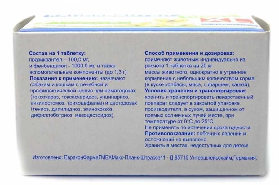 Препарат быстрее подействует, если питомец съест таблетку вместе с едой или сразу после принятия пищи. Лекарственные компоненты активнее всасываются одновременно с кормом и усваиваются желудочно-кишечным трактом. Фенбендазол и празиквантел начинают уничтожать внутренних паразитов уже спустя 1—3 часа после приема.