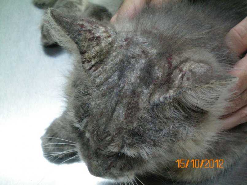 Ушная чесотка — кожное заболевание вызывают маленькие клещи красновато-бурого цвета. Они приносят невообразимые страдания кошкам. Животные расчесывают уши, мотают головой, ведут себя крайне беспокойно. Клещей в ухе видно невооруженным глазом. Этот ушной клещ у кошек удаляется с помощью растительного масла, которое закапывается в уши из пипетки, а через несколько минут, когда корки станут мягкими, очистите ушные раковины.
