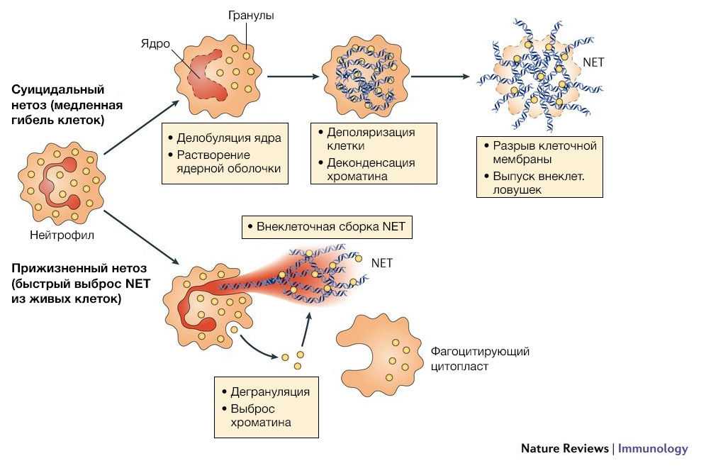 Описанный механизм называется suicidal NETosis (суицидальный нетоз). Однако известно, что нейтрофилы могут продуцировать NET, выделяя часть ядра или ядро целиком, и не нарушать целостность клеточной мембраны. Такой механизм получил название vital NETosis (прижизненный нетоз). Эти две формы одного и того же процесса имеют существенные различия. Во-первых, суицидальный нетоз вызывается в основном химической стимуляцией гранулоцитов и требует несколько часов для продукции NET, в то время как прижизненный нетоз активируется при раздражении нейтрофилов бактериальными агентами и занимает меньшее время. Во-вторых, vital NETosis не приводит к лизированию клетки, и она сохраняет способность к хемотаксису и фагоцитозу. Третье отличие заключается в механизме выпуска ловушек. Как было описано выше, при суицидальном нетозе происходит деконденсация хроматина, растворение ядерной оболочки и выброс содержимого клетки через перфорацию в плазматической мембране. Во время прижизненного нетоза происходит перенос ДНК из ядра во внеклеточное пространство с помощью везикул. Везикулы с ДНК, отделившиеся от ядра, проходят через цитоплазму и сливаются с клеточной мембраной, тем самым выбрасывая NET из клетки без перфорации мембраны .