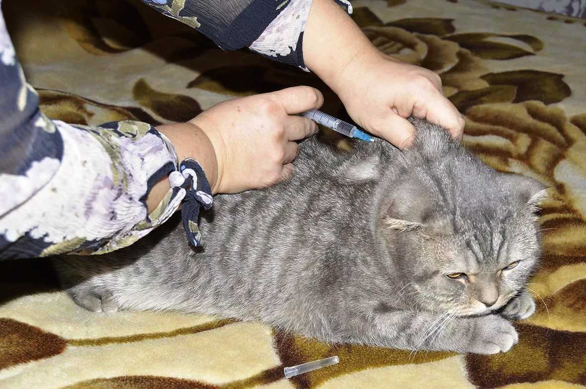 Перед вакцинацией важно обработать кожный покров животного 70% этиловым спиртом. Прежде, чем колоть укол котенку, стоит убедиться, что дезинфицирующее средство высохло