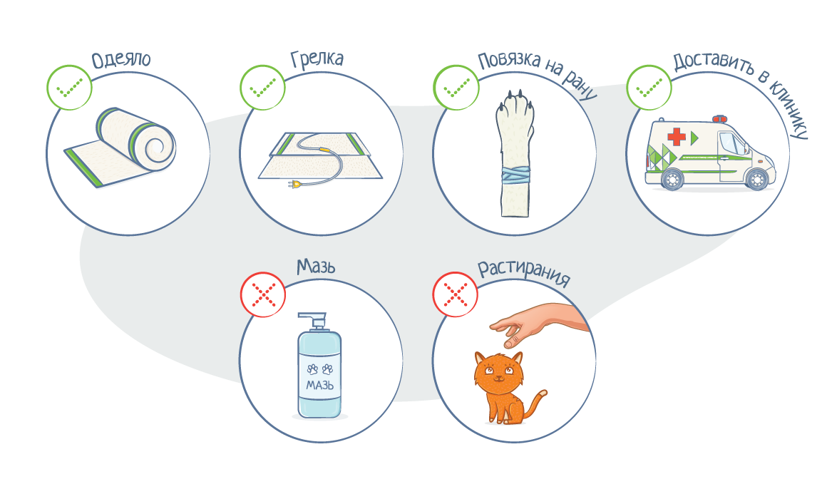 - Животное нужно укрыть теплым одеялом (пледом) или надеть на него одежду, поместить в теплое помещение, обложить грелками или бутылками с горячей водой (через одеяло, чтобы не было ожога кожи).