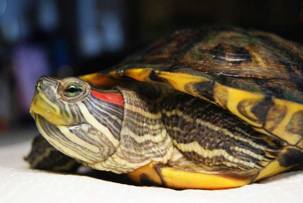- Заметно, что у красноухой черепахи отслаивается панцирь или размягчились кости.