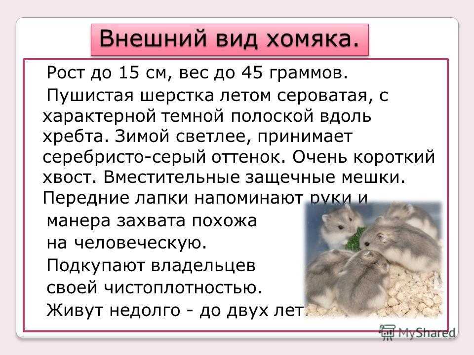 1. Хомяк – это грызун, чьим научным именем является «Cricetinae» — семейство Хомяковых включает 29 видов, которые относятся к 7 родам. В это семейство также входят знакомые многим мыши и лемминги.
