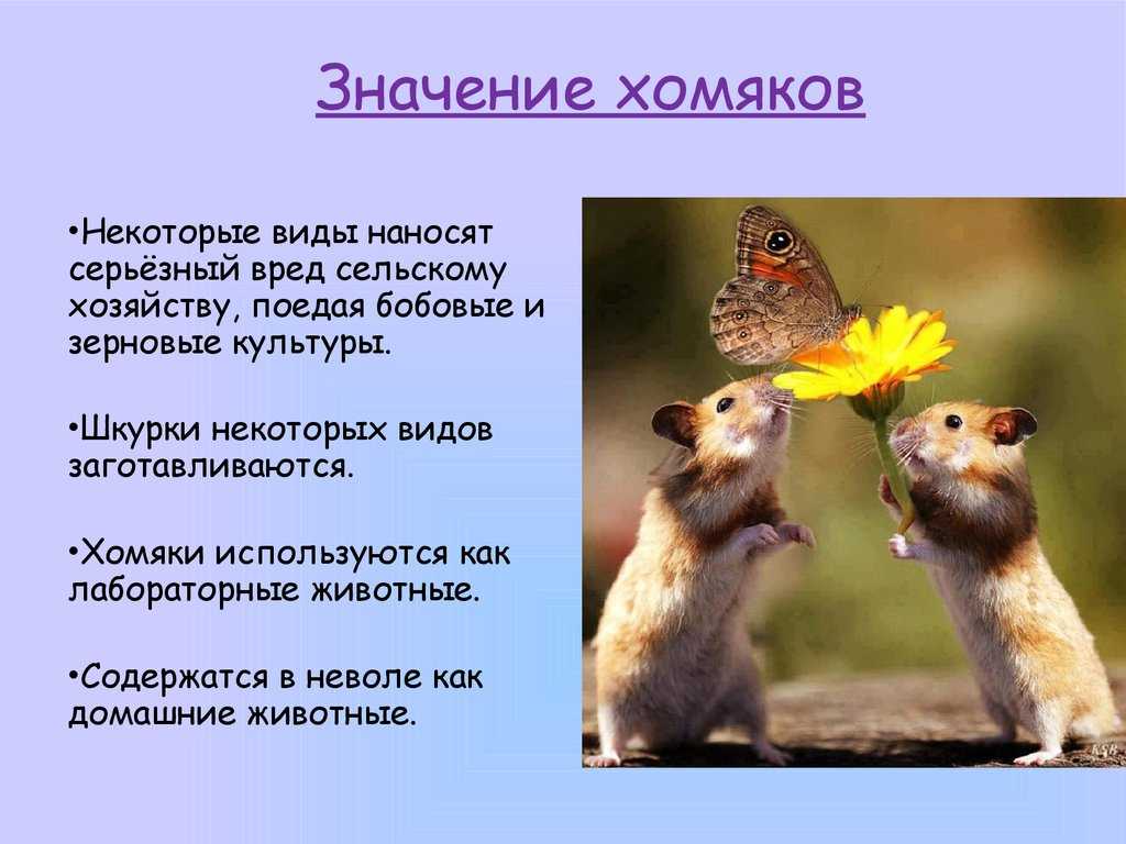 В любом случае, сейчас хомяки — это популярные животные, которые могут развеселить абсолютно любого человека. Их заводят в семьях, где есть маленькие дети. Хомяки могут жить как в клетке, так и на воле. Не стоит их бояться и следует подружиться с такими милыми зверятами, чтобы они также вошли в вашу жизнь и сделали её более насыщенной и интересной.
