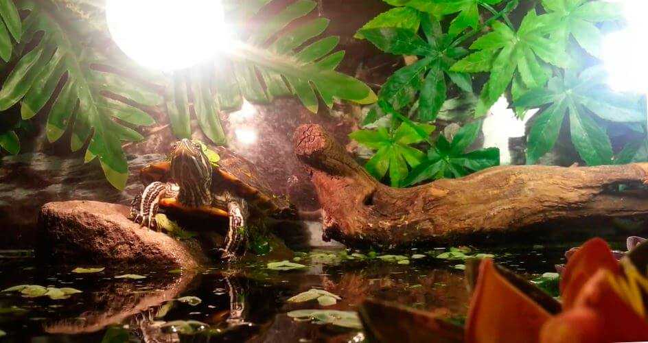 Обязательным условием должно быть устройство островка суши, который займет четверть от площади всего аквариума. На сушу животные выбираются для того, чтобы погреться, отдохнуть. Для поддержания оптимальной температуры, нужно взять обычную лампу накаливания, и направить ее на островок. Тогда и вода не будет требовать дополнительного подогрева.