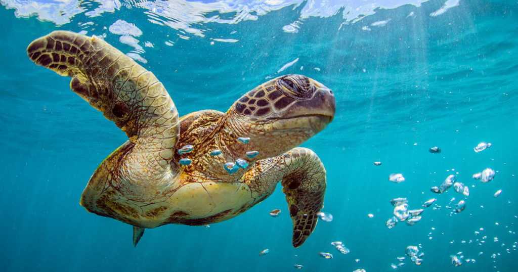 Обитатели морей отличаются от сородичей более крупными размерами. В воде чувствуют себя прекрасно, живут в основном в теплых тропических водах. Многих интересует вопрос о том, как дышат морские черепахи. Рептилиям вовсе не обязательно покидать свою привычную водную среду для того, чтобы запастись воздухом для поддержания жизнедеятельности. Многие виды имеют достаточно длинную шею. Достаточно просто высунуть голову из воды и сделать жизненно важный запас. У некоторых видов морских черепах полностью отсутствует панцирь.