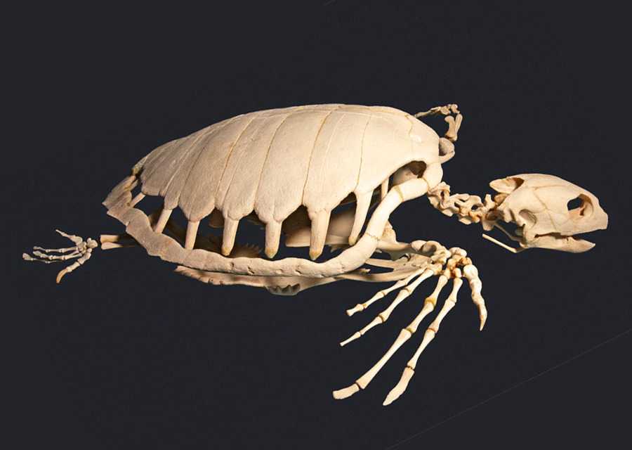 По внешнему виду панцирь похож на один сплошной роговой щит. На самом деле он имеет сложное строение и формируется из 50 различных костей путем вытягивания и срастания ребер и позвонков скелета. Если посмотреть останки ископаемых животных, можно увидеть, что карапакс с внутренней стороны напоминает находящуюся вне тела грудную клетку.