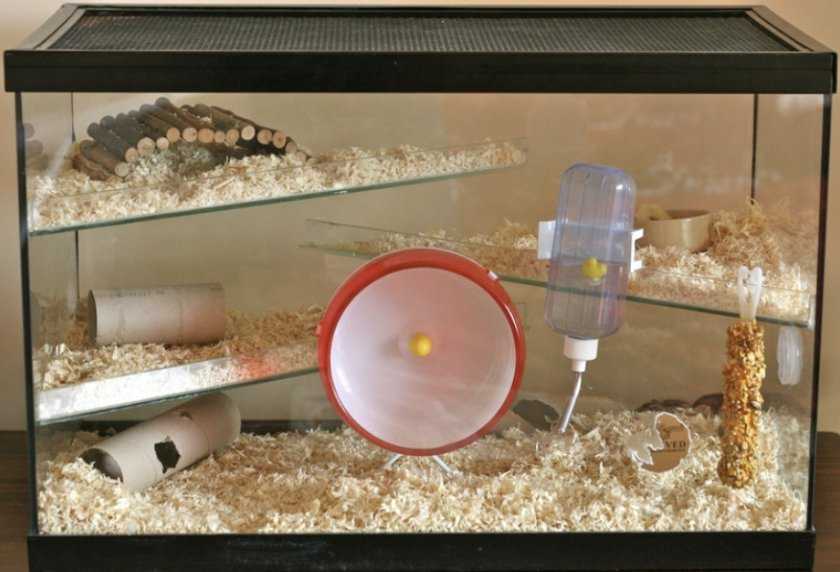 Пластиковый или стеклянный аквариум. В таком жилье меньше слышен шум и решается проблема с разбросанным наполнителем. Если с вами проживает кошка, то она не сможет добраться до зверька в аквариуме, если тот прикрыть воздухопроницаемой сеткой. Но у него есть существенный минус — он очень плохо пропускает воздух и его сложно убирать.