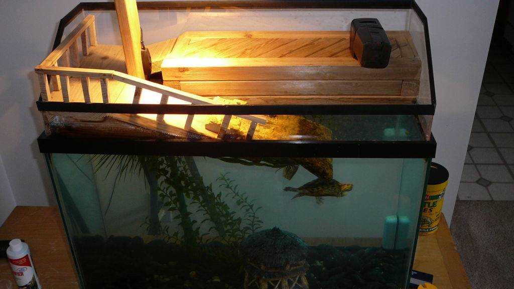Нужно обязательно установить все эти предметы, иначе рептилия будет страдать в неподходящих условиях. Черепаха должна плавать в просторном аквариуме, а затем вылезать на сушу и греться под лампой накаливания, как под солнцем. Благодаря ультрафиолетовой лампе рептилия сможет получать достаточно УФ-лучей, а значит и витамин D. Обогреватель будет поддерживать комфортную температуру воды и воздуха в акватеррариуме. Фильтр, расположенный снаружи домика, нужен для постоянного очищения воды.