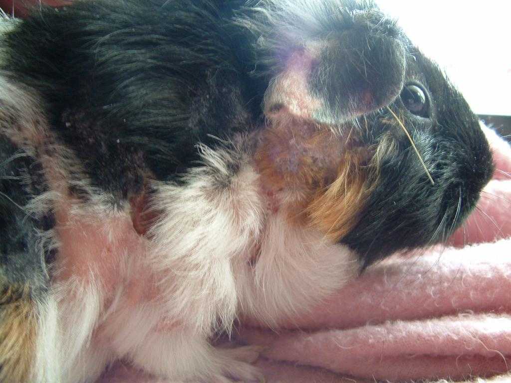 Еще одной причиной, заставляющей свинку чесаться, является грибок, или лишай, или дерматофит. Проявляется он чаще всего на мордочке, которая начинает зудеть, шелушиться, терять шерстку, а потом распространяется по всему тельцу. Кожа воспаляется, а шерстинки выглядят слипшимися. Внешне грибок напоминает свинкину перхоть.