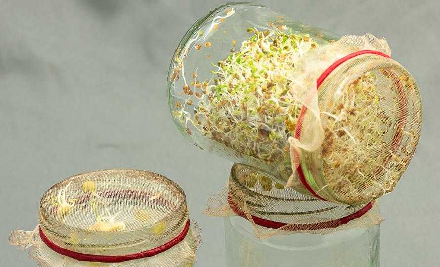 Семена засыпьте в банку и залейте небольшим количеством воды. На горлышко банки натяните сетку, зафиксируйте ее резинкой. Поставьте банку на подоконник. Когда семена набухнут, слейте воду и промойте семена несколько раз в свежей воде, не снимая сеточку с банки. Как следует слейте воду и положите банку на бок, а лучше установите под углом около 30° горлышком вниз так, чтобы стекала лишняя вода. Промывайте семена 2-3 раза в день, следя за тем, чтобы в банке после промывки не оставалась вода.
