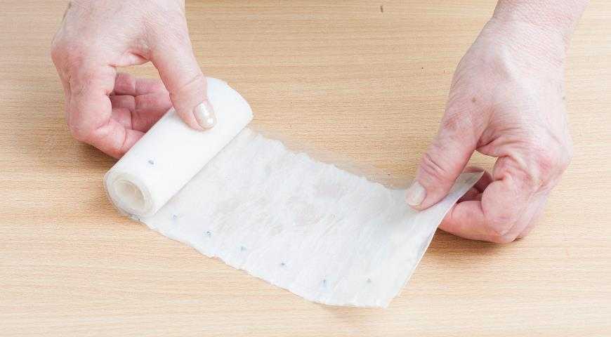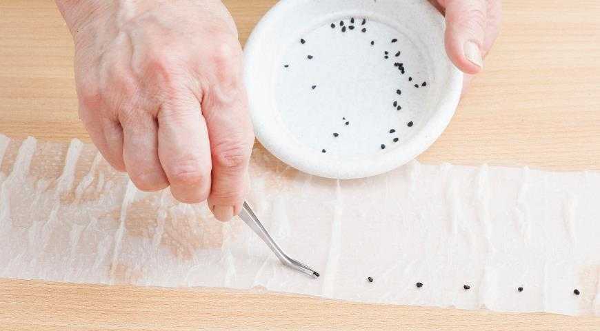 Полиэтиленовую пленку нарежьте полосками такой же ширины, как туалетная бумага. Длина полосок – 40-50 см; если семян у вас много, лучше сделать несколько небольших рулончиков, чем один, который будет слишком толстым. На готовые полоски полиэтилена раскатайте туалетную бумагу в один слой. Немного смочите ее из пульверизатора или спринцовки так, чтобы бумага не была слишком мокрой и не расползлась. Пинцетом разложите семена в ряд, отступая от края бумаги 1 – 1,5 см; расстояние между семенами – 4-5 см.
