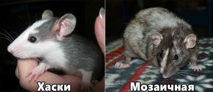 Породы крыс «хаски» и «мозаичная» отличаются от других своих собратьев окрасом шерсти. У «хасок» цвет шерсти двухцветный: белый и серый, имеет зачастую симметричный и правильный рисунок, а глаза отличаются оттенками красного цвета.