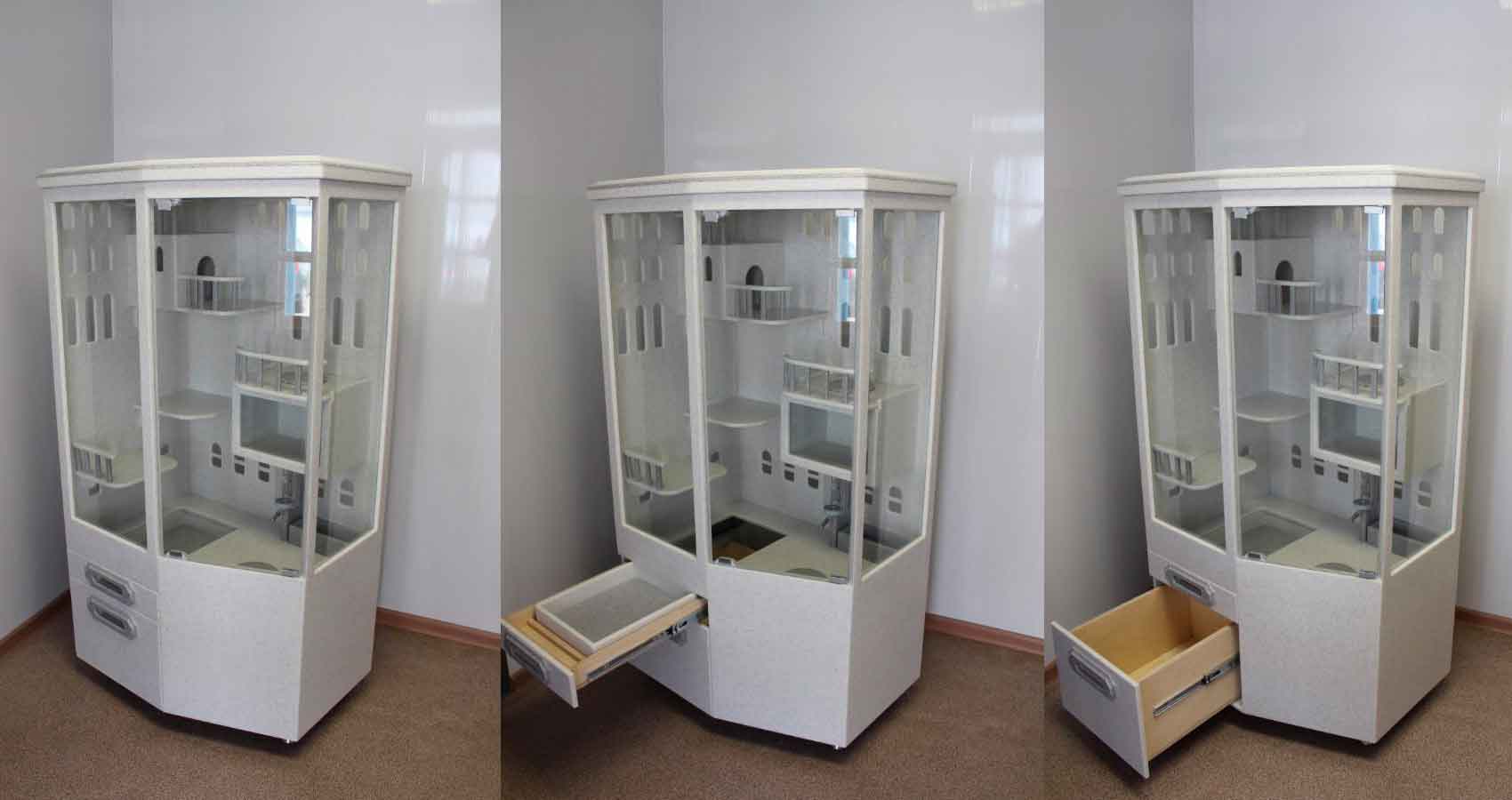 К сожалению, витрины не продаются в зоомагазинах. Их можно заказать у мастеров или сделать самостоятельно. За основу можно взять деревянные полки или старый комод.