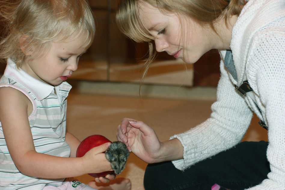 Маленькие дети могут съесть мусор или пораниться. Поэтому лучше предложить ребёнку наблюдать за действиями взрослого или выполнять простейшие задания под строгим наблюдением родителя. Обычно прирученный хомяк, который не испытывает страх, очень дружелюбный. Если малыш будет сильно сжимать зверька в руке и напугает его смехом или криком, то грызун может его укусить. В таком случае, рану следует обработать.